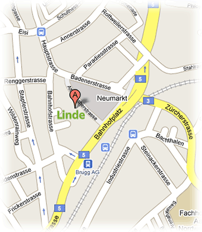 Die Praxis befindet sich in Brugg am Neumarktplatz 16 im 1. Stock, Eingang zwischen H&M und der Amavita Apotheke und Drogerie.
